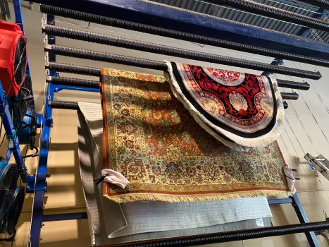 After weaving, rugs are thoroughly washed to remove excess fibers and dust, then naturally dried to set colors and texture.